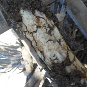 El ataque comienza en la parte interna de la madera, quedando la parte externa en ocasiones aparentemente intacta. La obrera desgarra la celulosa con sus mandíbulas y la ingieres, la tritura a nivel de la molleja. Posteriormente pasa al estómago donde actúan las enzimas y sigue su camino hasta la cámara de fermentación donde es transformada por los protozoos proporcionándole energía.
